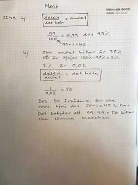 och just denna fråga kan jag inte svara på .. det står i facit 50 killar! men hur då ? Jag har också tittat på youtube förklaringar och frågat en lärare som erbjuder läxhjälp och hans förklaring är så här som det nedvisas i bilden men jag förstod inte varför de utgick från att andel killar är 98%!