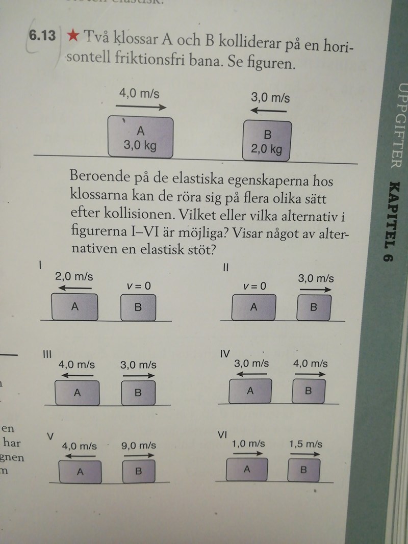 Alternativen I till VI visar förslag på hur klossarna rör sig efter kollisionen.