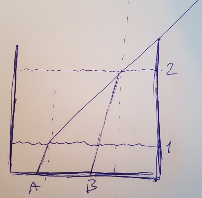 Jag tittar alltså i samma riktning från samma position vid de båda vattennivåerna. Infallsvinkeln blir då densamma i de båda fallen.