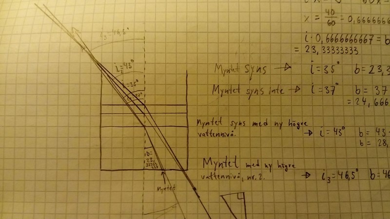 Jag har gjort två ögon. Det första var då man ser myntet (infallsvinkel 35). Det andra är när man inte ser myntet (infallsvinkel 37). Fast det första ögat behövs väl egentligen inte. Sen har jag med gradskiva gjort brytningsvinkeln mot normalen för båda. Sen från det ögat som inte ser myntet har jag prövat med höjd vattennivå 2 gånger. Sen har jag fått fram brytningsindex på mitt egna sätt som inte är som boken lär ut och det blev nästan rätt i det här fallet (brytningsindex typ = brytningsvinkel/infallsvinkel). Fast håller med om att det exakta sättet att göra det på är bättre (använda brytningslagen. I.a.f. så på ett ungefär så kan man i.a.f. se att trots högre vattennivåer så ser man långt till höger om myntet och inte myntet. Ifall jag med brytningslagen skulle göra linjerna igen, så verkar det trots allt svårt att tro att man skulle kunna se myntet.