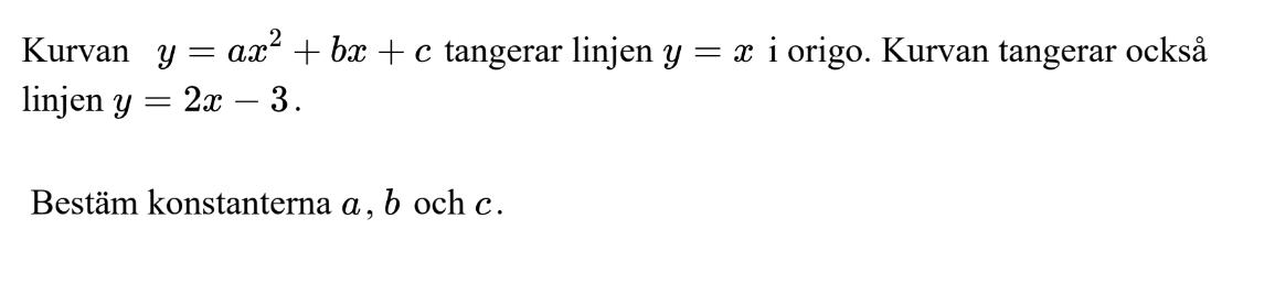 Om du tittar på funktionen y = ax2+bx+c och vet att kurvan går genom punkten (0,0) (eftersom den tangerar en linje där) så kan du räkna ut vilket värde en av de tre konstanterna har. Vilken konstant, och vilket vörde har den?