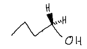 Alla molekyler har ju en tredimensionell struktur som beror på hur dess atomer pekar i rymden, och detta är viktigt för en E2-mekanism. Den feta "kil"bindningen innebär att bindningen pekar ut mot oss och den streckade bidningen betyder att bindningen pekar in i planet, "bort från oss". En vanlig linje innebär att bindningen ligger i planet. Om du medvetet gör synen "suddig" (genom att "unfocus" med ögonen) kanske du kan känna den tredimensionella strukturen i bilden jag komponerade ovan.
