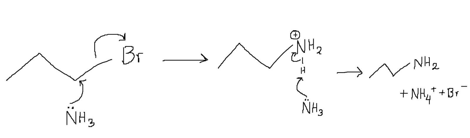 Hej! Jag har fått en fråga där 1-brompropan och NH3 reagerar genom en SN2-reaktion. Varför är det C3H7NH2 + HBr som bildas och inte C3H7NH3+ + Br- som bildas? Tänker att ammoniak inte har något problem med att göra 4 bindningar, och efersom HBr är en stark syra borde väl Br- inte vara särskilt benägen till att protolyseras till HBr?