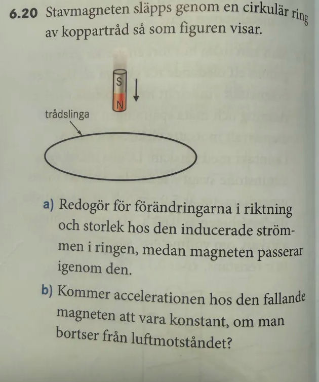 Hej! Har en uppgift här om inducerad ström. För a) förstår jag att det först går en ström moturs och sedan medurs pga Lenz lag. b) känner jag mig osäker på då jag anar att magnetfältet som bildas borde påverka magneten, men är lite osäker på hur man skulle bevisa detta?