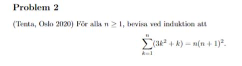 "För alla n≥1, bevisa med hjälp av induktion att \sum_{k=1}^n (3k^2+k) = n(n+1)^2."