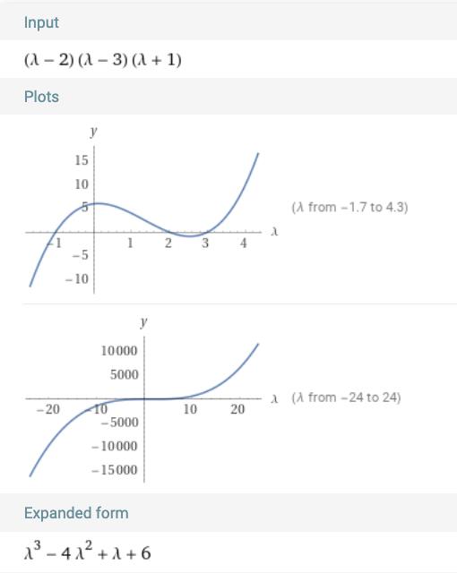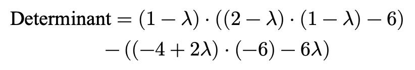 Vilket förenklas till λ3-3λ2-22λ+24\lambda^{3} -3\lambda^{2} -22\lambda +24