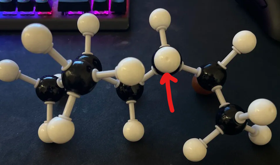 Nej det är det inte, så "absolut" var lite missledande. Men genom rotationerna kommer antingen metylgrupp eller väte kunna vändas mot/från vätet på kol 3.