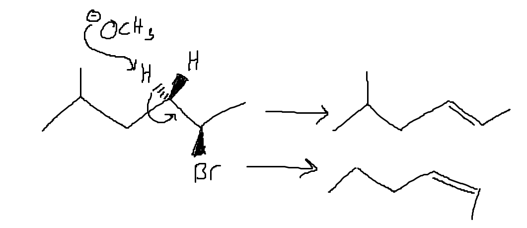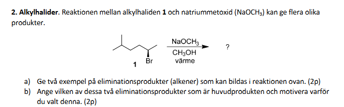 Jag ser ju att det finns två möjliga β-väten som kan abstraheras, och det är uppenbart att det väte på β-kolet till vänster om α-kolet är det som kommer abstraheras, eftersom det bildas en sekundär alken istället för en primär alken.