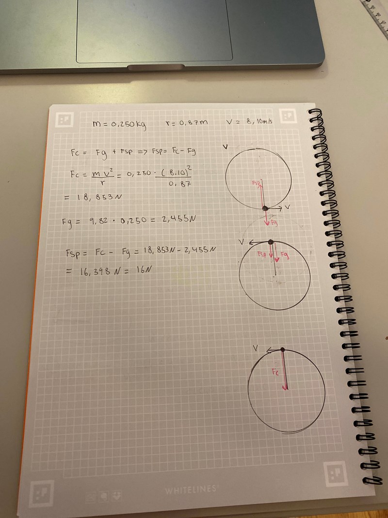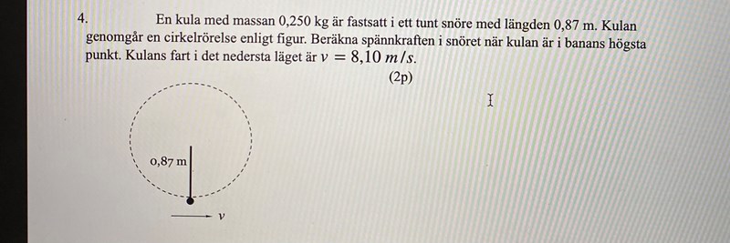 I så fall kan du beräkna hur stor den resulterande kraften då måste vara (p.g.a cirkelbana), och därifrån får du ut snörkraften.