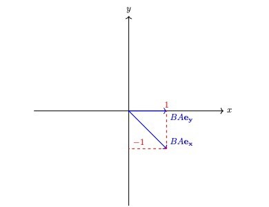 Figuren illustrerar den sammansatta avbildningen för basvektorerna och under linjär transformation . Blåa pilar representerar avbildningen av respektive basvektor. Röda streckade linjer visar var respektive avbildning hamnar i förhållande till ursprungspunkten.