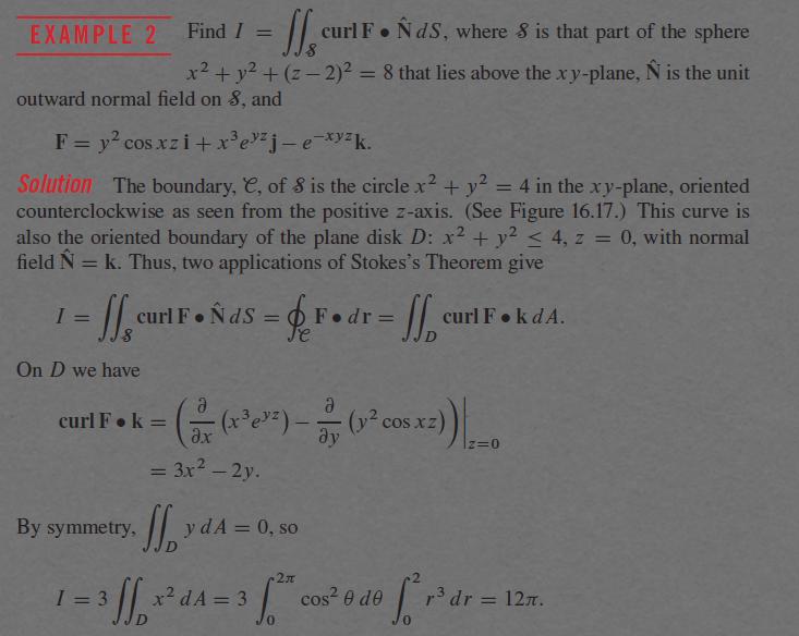 Cirkeln C är rand till skivan D. Eftersom cirkeln även är rand till det ”sfäriska”området S så blir ytintegralen över skivan D lika med ytintegralen över ”sfären” S pga Stokes. Man väljer att räkna ytintegralen över skivan eftersom det ser ut att vara enklare.