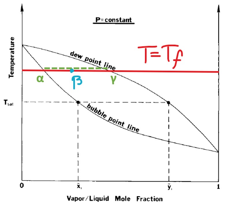 Molbråket för beta är olik från bubbelpunktslinjen respektive daggpunktslinjen vid den temperaturen. Vid denna temperatur kommer ångan som bildas ha sitt eget molbråk (α) och samma sak med molbråket för den vätska som kondenserar (γ). I princip finns det ånga/droppar i gasfas längs den gröna linjen, men innanför bubbel-/daggpunktslinjerna (längs gröna linjen).