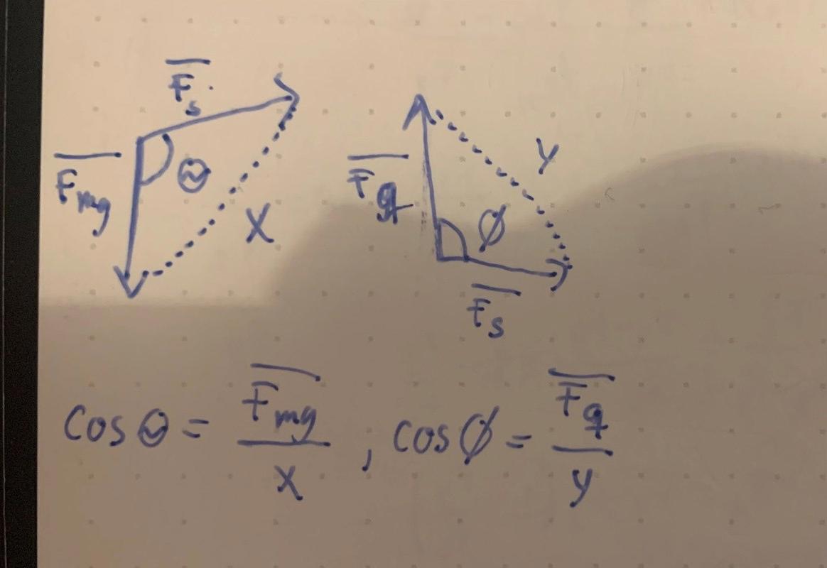 |Fq|cosϕ=|Fmg|cosθ\lvert \vec F_q \lvert cos \phi = \lvert \vec F_{mg} \lvert cos \theta. Jag får följande trianglar om jag ritar upp det som lösningsförslagen föreslår: