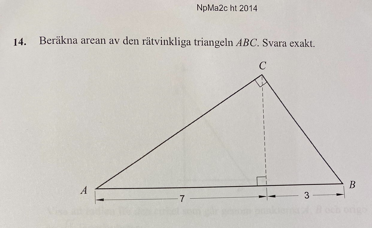 Ja okej, jo jag vet vad svaret ska vara. Tyckte bara de va konstigt att jag inte kunde få fram samma svar som han fick dvs . Men har räknat uppgiften ett par gånger nu och jag förstår att jag tänkte lite fel med sidorna. Tänker nu från vinkeln 90 grader till b är ju en sida som är likgiltig till den andra triangelns sida som då är från 90grader till vinkeln b. Så blir enklare då. Men tack för svar!
