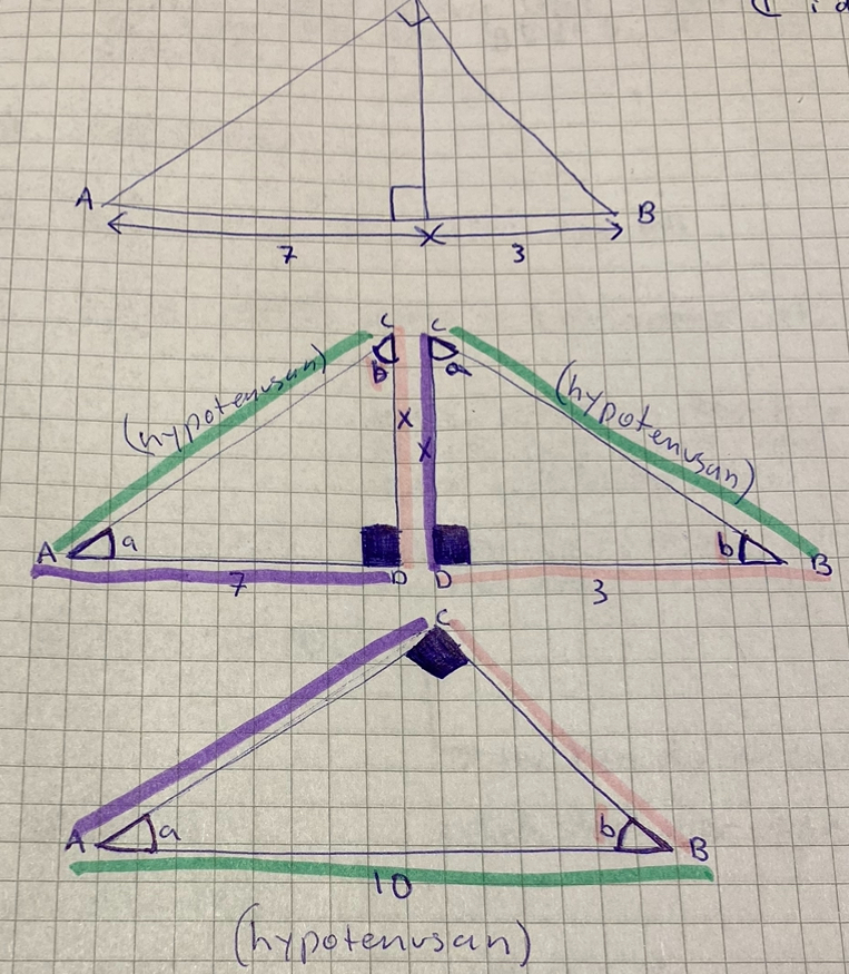 Nu till min fråga, varför kan jag inte ställa upp det som jag gjorde, varför blir det fel när jag ställer upp ena ”triangelns värden” så, dvs X/7 då borde jag kunna göra detsamma på den andra? Dvs X/3 & få ihop det som: X/7=X/3 ?
