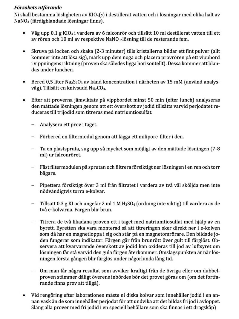 Börja med att berökna hur många mol tiosulfat det går åt för att titrera ett jodat-prov. 1  mol tiosulfat är ekvivalent med ½ mol jodatjoner. På detta sätt kan du få fram ett värde för substansmängden tiosulfatjoner i 3 ml KIO4(aq). Vad är det man frågar om?