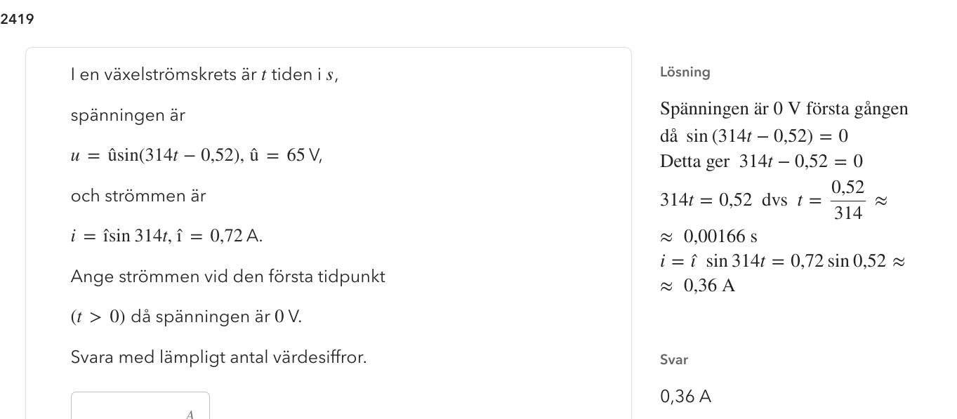 Vilken lösning vill du ha till när u = 0V för första gången om u = 65sin(314t-0,52)? Det skall alltså vara den minsta positiva lösningen.
