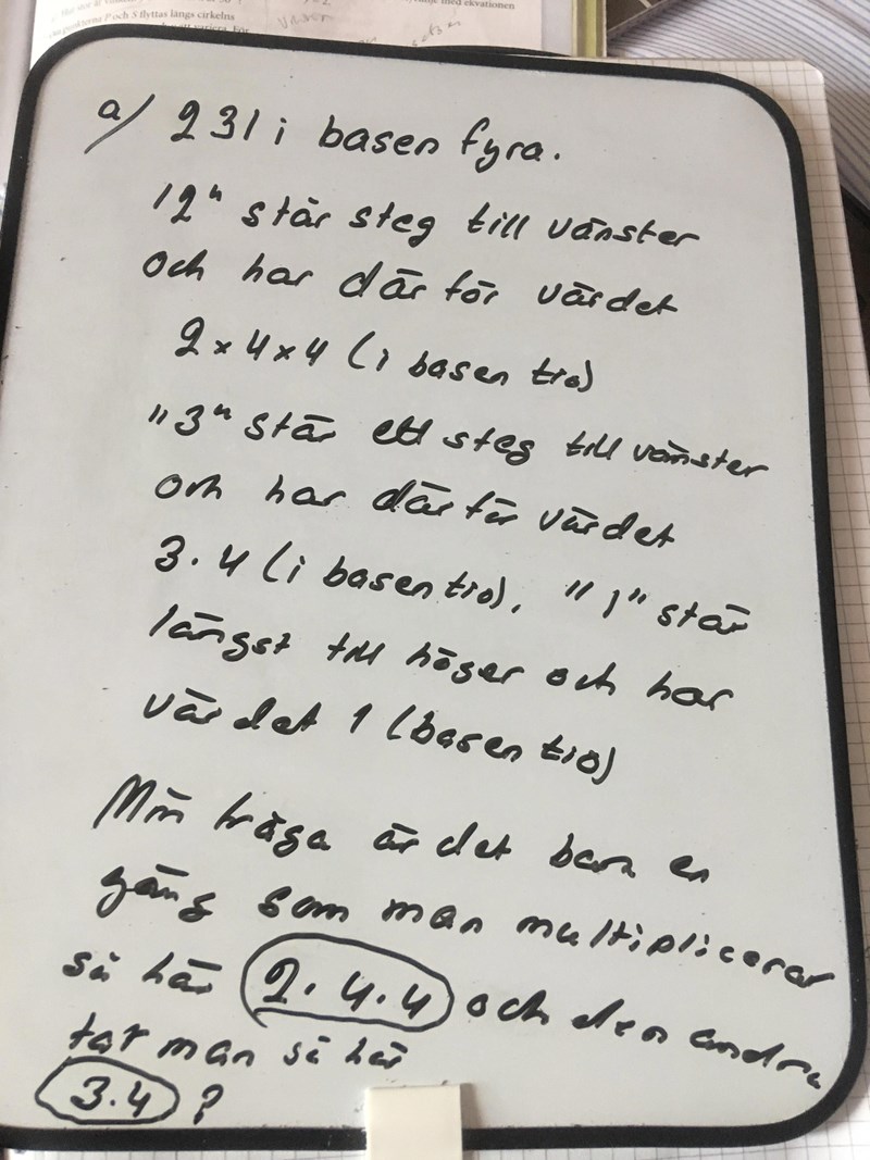 a) 231 i basen fyra. '2' står två steg till vänster och har därför värdet 2x4x4 (i basen tio). '3' står ett steg till vänster och har därför värdet 3x4 (i basen tio). '1' står längst till höger och har värdet 1 (i basen tio).