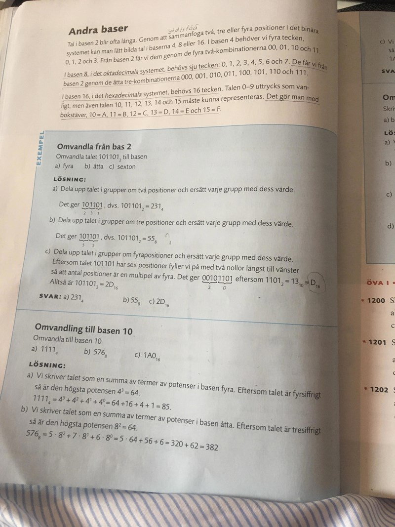 c) 2D i basen sexton. '2' står ett steg till vänster och har därför värdet 2x16 (i basen tio). 'D' står längst till höger och har värdet 13 (i basen tio). Tänk att efter '9' (nio) fortsätter det med 'A' (tio), 'B' (elva), 'C' (tolv) och sedan 'D' (tretton). Det är med andra ord inte så att man alltid ska fylla på med två nollor när det är basen sexton.
