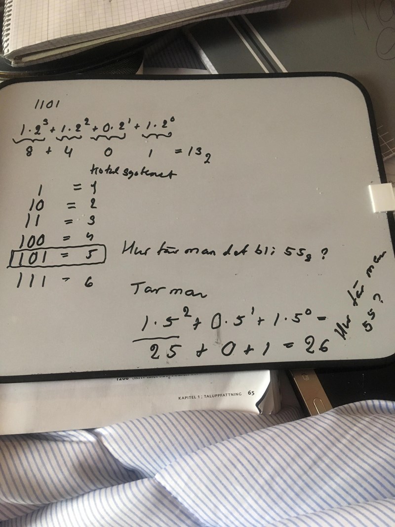 b) 55 i basen åtta. Första '5' står ett steg till vänster och har därför värdet 5x8 (i basen tio). Nästa '5' står längst till höger och har värdet 5 (i basen tio).