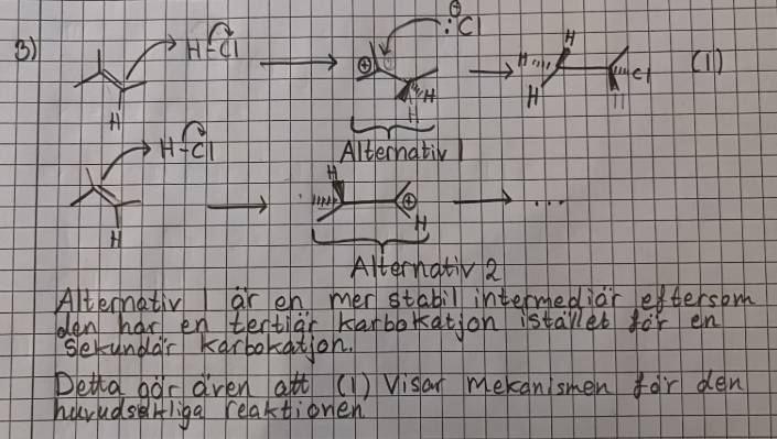 En fråga dock angående stabilitet på intermediären. Är det rätt resonemang att anledningen till att den tertiära karbokatjonen är mer stabil än den sekundära är för att den tertiära kan få mer elektrondensitet donerad än den sekundära?