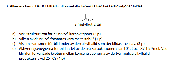 Det jag menade var att det är alkenkoncentrationen som ska stå med i hastighetsuttrycket och inte vätejonskoncentrationen, eftersom det är det första steget (bildningen av karbokatjonen) som är hastighetsbestämmande. Stämmer inte det? Hur tycker du att uttrycken bör se ut?