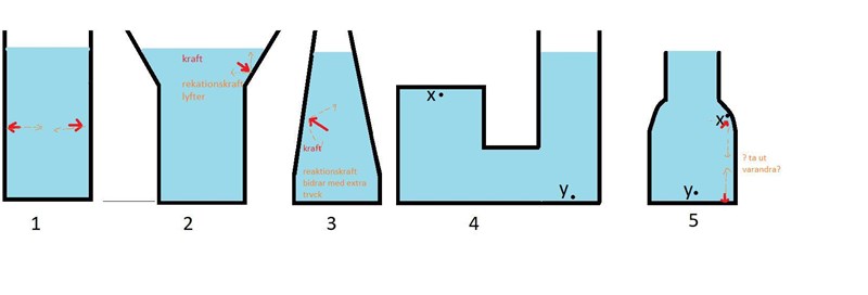 4 Hur kan det uppstå en nettokraft i form av en rekationskraft nedåt i fig 5? Borde inte det reaktionskraften nedåt "tas ut av"/kompenseras av att det finns en reaktionskraft uppåt (vattnet vid punkt x tryck ju också nedåt mot botten som borde svara med en reaktionskraft). Detta sker ju i fig 1, vi har tryck på båda väggarna, höger och vänster, men de tar ut varandra och skapar ingen nettokraft (annars hade ju trycket ökat in i det oändliga varje gång trycket möter en vägg som skapar en reaktionskraft) .