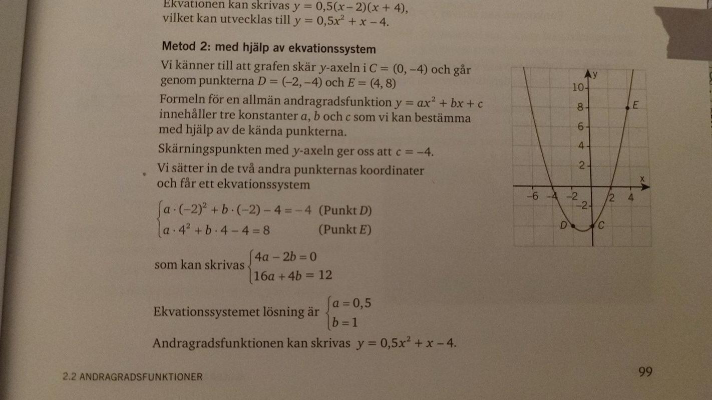 Vi har nu bestämt värdet på konstanten c och vi kan därför skriva andragradsfunktionen som f(x) = ax2+bx-4.