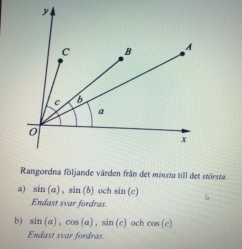 Jag kikade på länken som du postade Max. Jag scrollade igenom allt och dem trigonometriska definitionerna känner jag igen. Det har jag bekantat mig med tidigare. Oavsett om jag kan dem trigonometriska definitionerna så begriper jag inte vad det är jag ska göra i uppgiften för att korrekt kunna rangordna värdena? men vad kan jag då göra med det för att exempelvis veta något om ? Jag menar, jag har ingen aning vad det är uppgiften vill att jag ska rangordna mer.