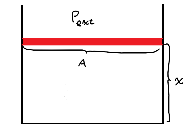 Det röda stycket är vår (friktionsfria) kolv av massa , som kan flytta sig upp och ned i gastuben, dess tvärsnittsarea, och där betecknar avståndet från denna till botten av kolven. är omgivningens genomsnittstryck på kolven. Ur Newtons andra lag vet vi att:
