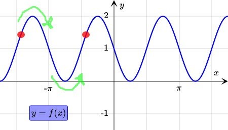att kurvan byter riktning (uppåt/nedåt) två gånger varje period.
