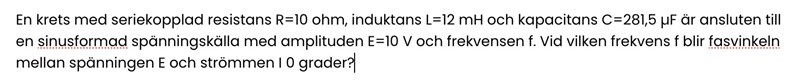 jag hittade den på formelbladet och ser att jag har den information som behövs för att få ut frekvensen. mitt svar blir 86,6 Hz när jag räknar ut men har inget facit att jämföra med