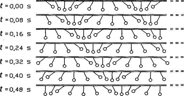 Jag kollade då på den sista raden, på de kulor som var helt lodräta och att det därför vid dessa uppstått noder. Från en nod till nästa ska det vara en halv våglängd, så under de 0,48 s borde det väl i sista raden vara 1,5 våglängd? Detta skulle i så fall göra att frekvensen är antal svängningar/tid --> 1,5/0,48 = 3,125 Hz.