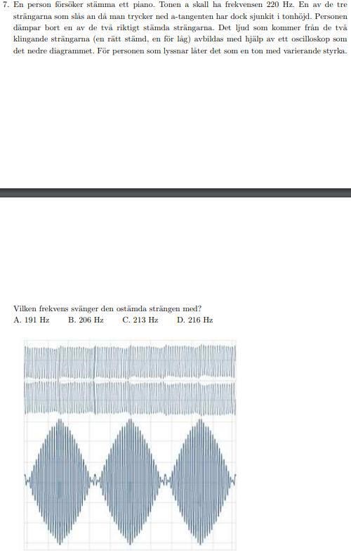 Svävningsfrekvensen är då c:a en faktor 1/28 av någon av de två frekvenserna (som är väldigt lika), så 220Hz/28 ≈ 8 Hz. Den okända frekvensen är då 228 Hz eller 212 Hz. Inom mätfel så blir 213 Hz rimligt.