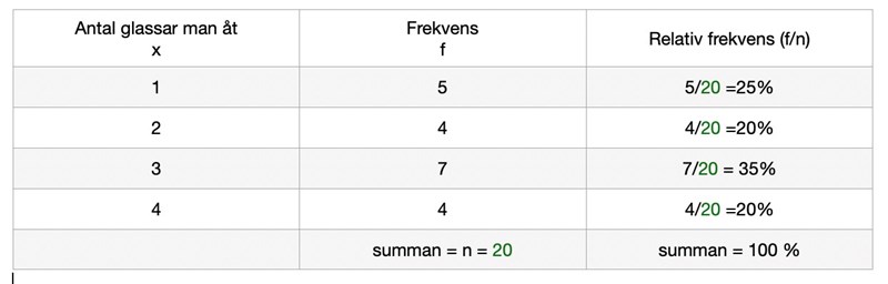 - Hur många procent (Andelen) av eleverna åt 1 glass var. Svaret är : 5 av 20 elever åt en glass = 5/20 = 25%