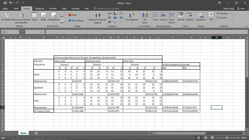 Nu ska det handla om moths igen. Som ni ser finns det nio stora grupper av celler, var och en av dess nio representeras av ett medelvärde och standardavvikelse. Nu är det såhär att vi ska räkna ut allele frequency, alltså hur ofta en allel förkommer i en population. I detta fall har jag tre populationer som lever i tre olika områden. Jag och mina klasskamrater är oense om detta, för vi har gjort på två sätt: