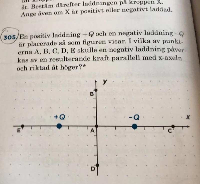 Nån idé på hur jag kan komma igång med uppgiften? Jag vet att jag har två laddning: en positiv och negativ på x-axeln. Men jag vet inte vilka laddningar A, B, C, D & E har?