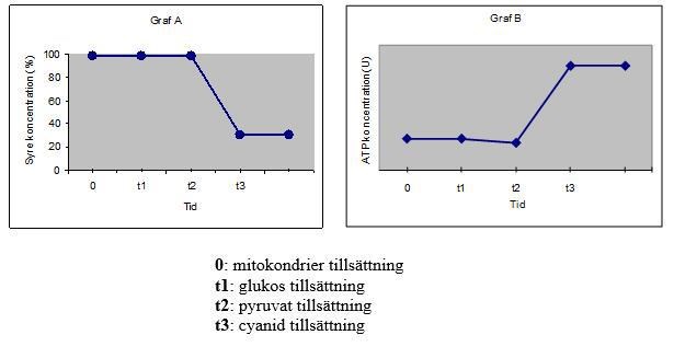 När glukos tillsätts omvandlas glukosmolekylen till två pyrodruvsyror men då detta sker utanför mitokondrien påverkar inte glukosen något eftersom det enbart är fria mitokondrier och inte hela celler. Det sker ingen glykolys (?). Citronsyracykeln går alltså inte igång förens pyruvat tillsätts, därav minskar syrekoncentrationen och ökar ATP-koncentrationen när detta tillsätts. Cyanid inhiberar, alltså blockerar, elektrontransporten att ske genom att cyanidjonen blockerar ett av enzymerna som elektrontransporten är beroende av. Detta är anledningen till att syrekoncentrationen och ATP-koncentrationen stannar av/är densamma, då mitokondrien dör.