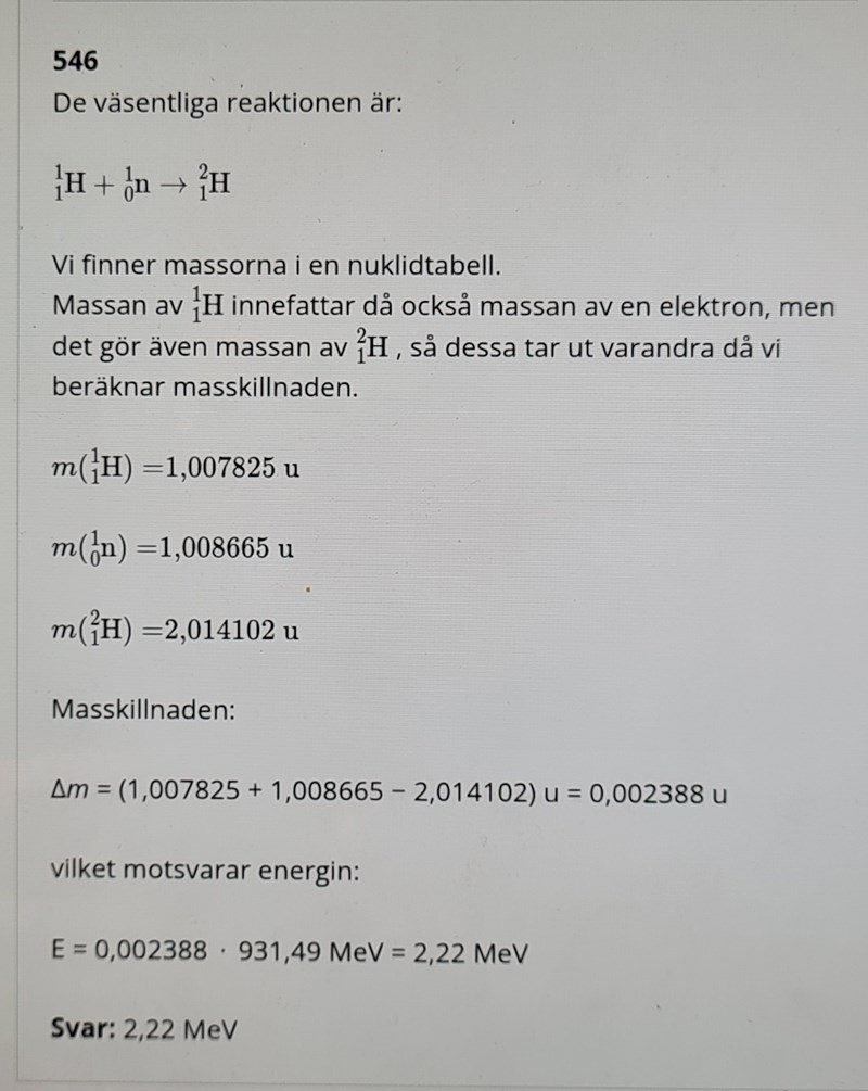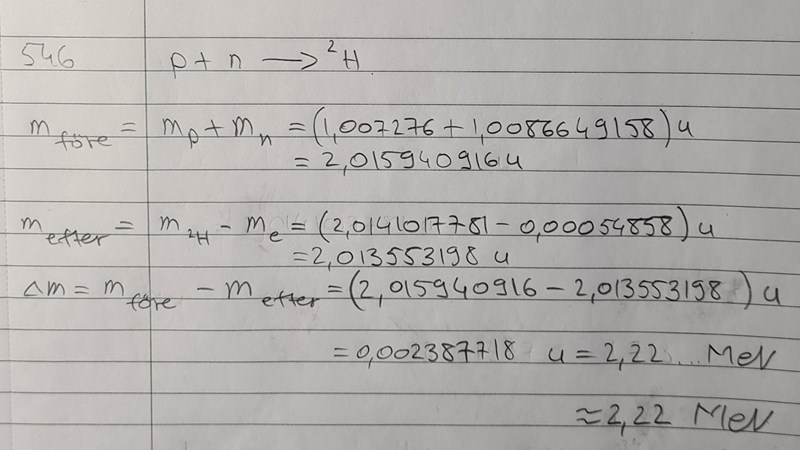 Och anledningen till att det är samma svar 2,22 MeV är att elektronmassorna tar ut varandra (för vanliga atommassor) eller som jag gjorde och räknade endast kärnmassor (proton är vätekärnan) :)