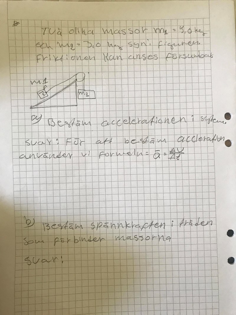 Börja med att sätta ut vilka krafter som verkar på de två massorna.
