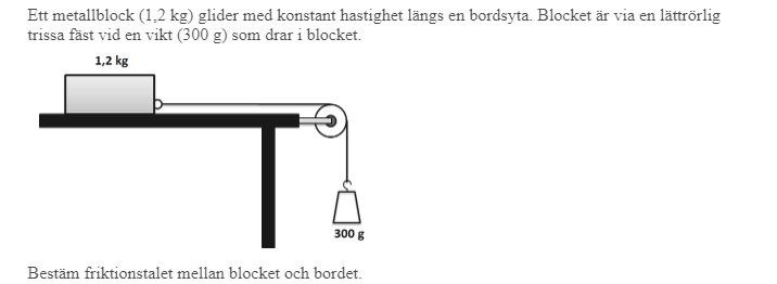 Svaret ska bli att friktionstalet är 0.25. Jag förstår typ lösningen. Det jag inte förstår är hur Ff får (0.3*g). Alltså kraften som 300 g vikten får av gravitation. Men hur kan de bara bortse spänningen i snöret som drar upp 300g? Trots att det är konstant hastighet?