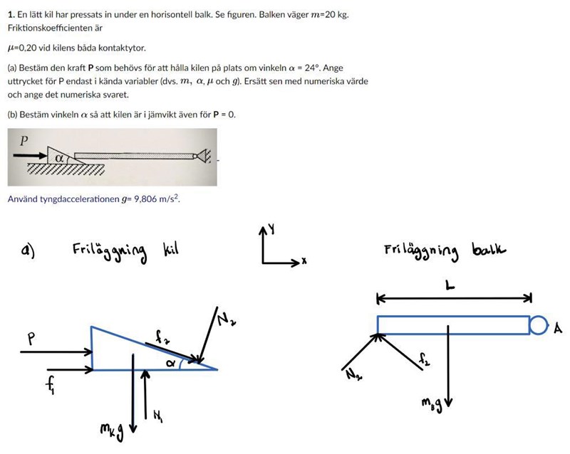 Om jag trycker in kilen vill ju friktionen både från underlaget och balken "jobba emot" men det ska inte spela någon roll då de faller ut med rätt tecken och riktning från jämviktsekvationerna.