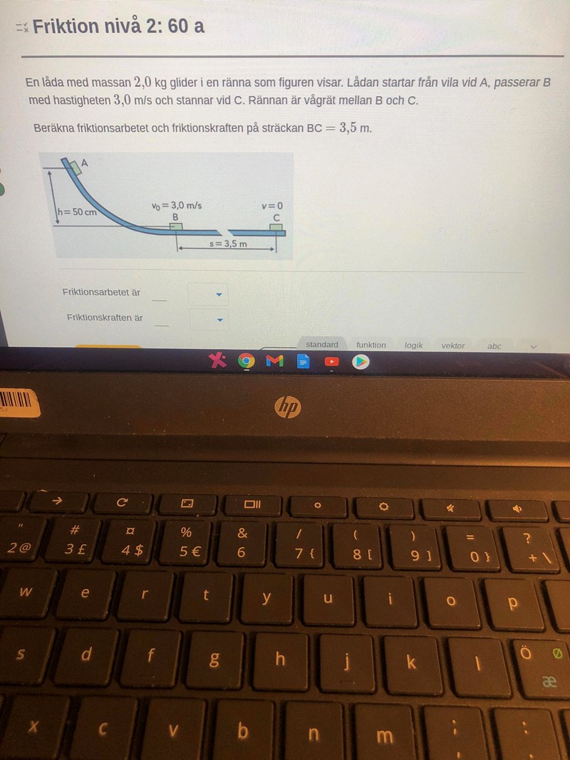 Om jag ska beräkna friktionsarbetet så krävs det väl att jag kan beräkna förändring av den kinetiska energin. Så formen för kinetisk energi för B (dvs jag använder 3 m/s som v) och detta tar jag minus c (men stoppar då in i formen men tar v=0)?