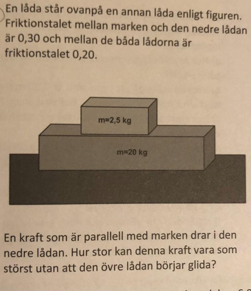 Dr. G skrev:Vilken är den maximala friktionskraften på den övre lådan. Vilken acceleration får den då?