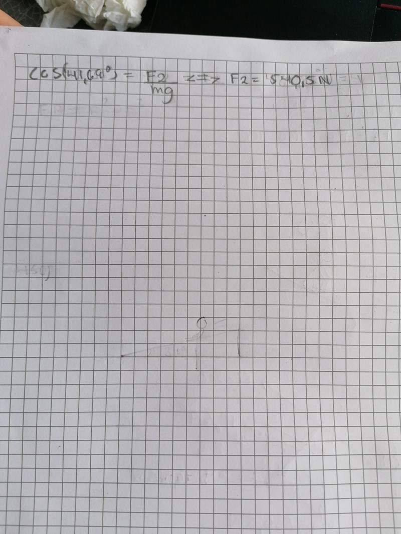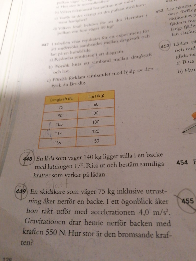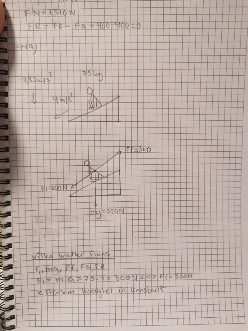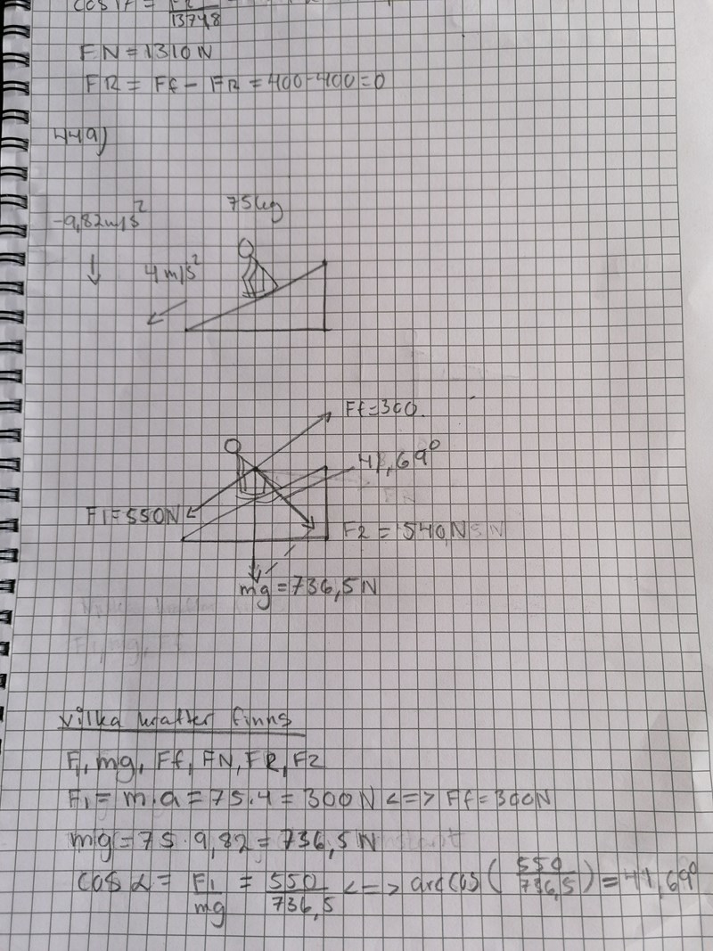 Uppgift 449) behövs lite hjälp med. Den framåtdrivande kraft, f1 beräknas till 300N m.h.a newton's andra lag. Mg är angiven som 550N. Om hastigheten är konstant betyder det att F1 är lika stor som F1. Ff är vad jag tror är den bromsande kraften.