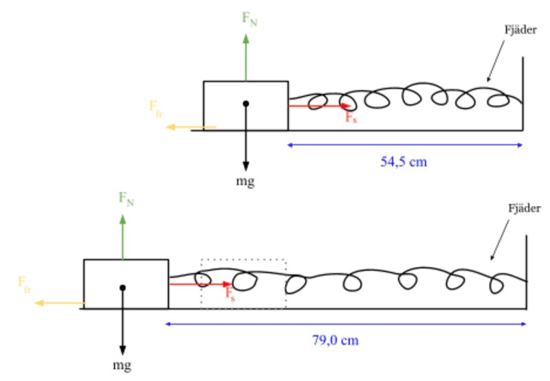 Jag förstår inte vad detta betyder. Menar du att den låg stilla i jämvikt mellan statisk friktionskraft och fjäderkraft? Eller drog man med en kraft? Mycket oklart. Vi behöver bestämma fjäderns elasticitetskonstant på något vis och för det saknas information.