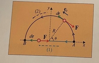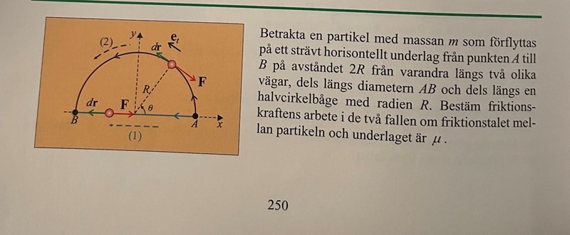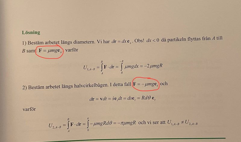Hur kommer det sig att friktionskraften F är positiv längs diametern (A->B) men negativ längs halvcirkelbågen?