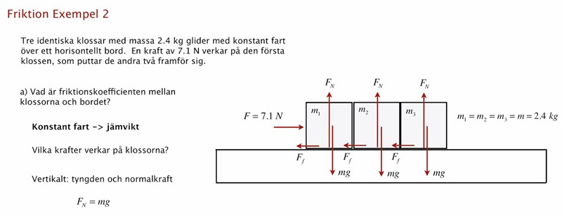 Jag behöver hjälp med dessa två uppgifter. i uppgift a) förstår jag för att få fram friktionstalet var det F/3mg=μ. Är det rätt? Ändras friktionstalet beroende på om det är en kloss eller tre klossar?