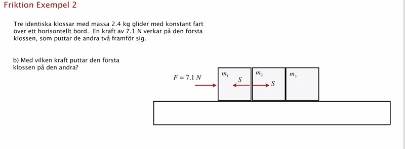 b) S är den kraft med vilken den fösta lådan puttar på den andra lådan. Enligt kraft-motkraft-principen så puttar låda två på låda ett med en lika stor men motriktad kraft. Detta illustreras i figuren.