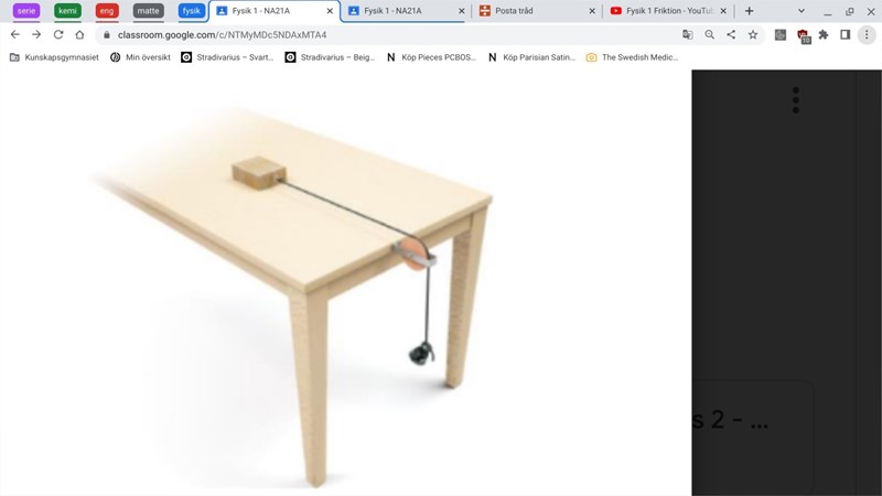 Fråga 2: Viktens massa är 0,50 kg och klossen väger 2,0 kg. Friktionstalet mellan kloss och bord är